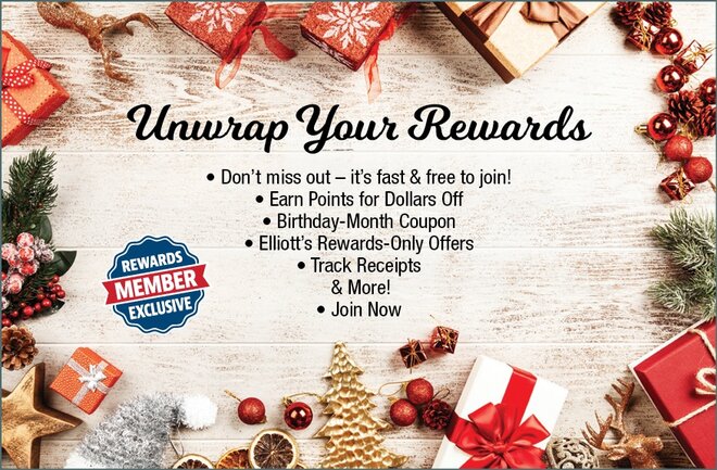 *Sale pricing valid Dec. 1 – 31, 2025. Limited quantities available. Valid on in-stock items only, while supplies last. No rainchecks. Member exclusive offers and sale prices valid in-store for Elliott's Rewards members only.